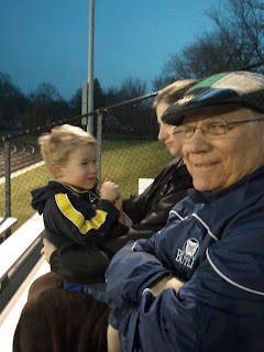 I would have taken a picture of Scott in goal if my cell phone camera could get close enough, so I had to settle for a picture of my dad, Amanda, and Ben in the stands. Scott’s girlfriend was with us, but seemed to always switch sides to the goal he was defending…..he best pay attention too….