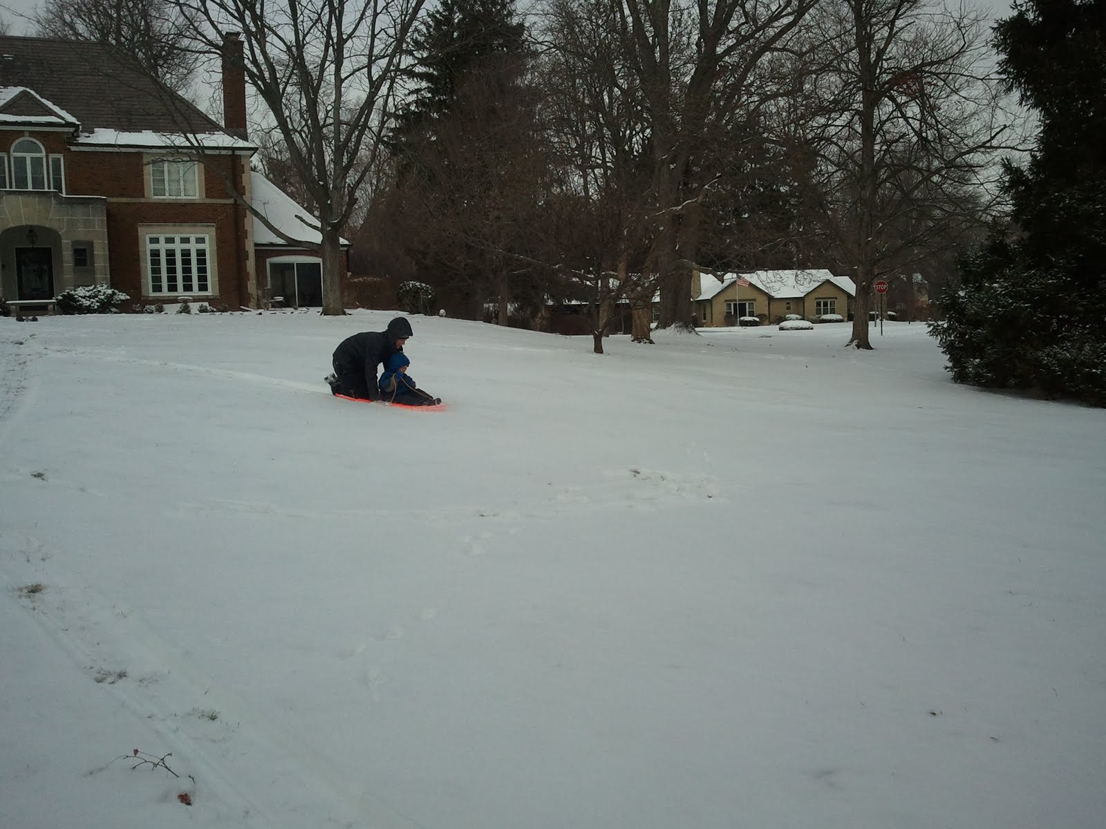 They both laughed their brains out going up and down the hill in our front yard and were both covered with snow. Steph rode with him on the sled quite a few times until he was comfortable, then she pushed him down own his own a few times too.